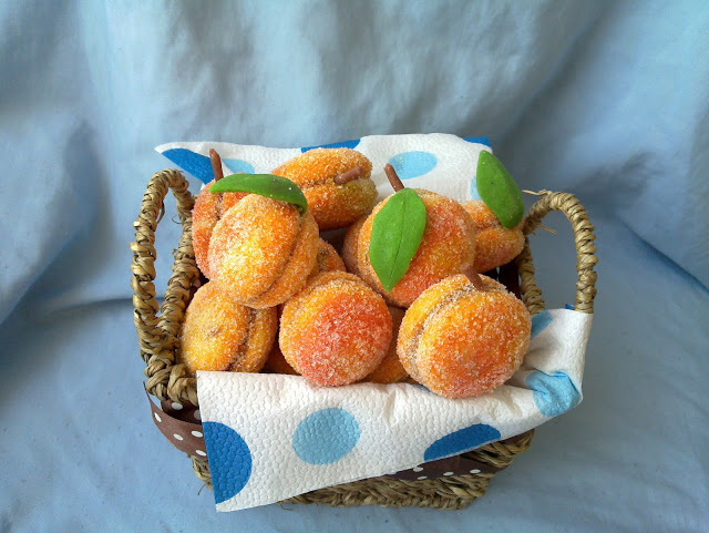Kettesével betöltjük a félgömböket, vízben oldott ételfestékkel, ecset segítségével narancsosra, zöldesre pingáljuk a gömböket, és kristálycukor bundát pörgetünk rájuk. Pici csokiszilánkkal, pici marcipánlevélkékkel lehet díszíteni.