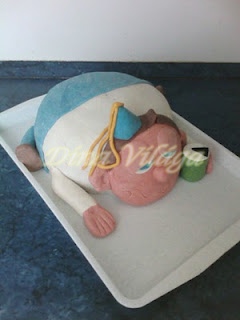 A tortaviharból párom sem maradhatott ki, találtam is neki egy jó ötletet Carol-nál. Akkor még csak kísérleti stádiumban voltam bevonóügyileg, ez egy fura fondanttal készült, amit gyorsan el is vetettem. Nagyon elszúrtam, tört, repedt, az arc csupa ránc lett, mikor feltettem. Arról nem is beszélve, hogy akkor kaptam meg csili-villi új játékszereimet, a profi por festékeket, és nagyon nem tudtam a mennyiségeket. Valódi napon sült negró lett belőle, azt hiszem nem is tartottam meg a képet, vagy csak most nem találom…no mindegy, elkészült a level2 változat is, hát ilyen lett: