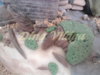 Itt az utolsó képen látszik, hogy a falak csak marcipándarabok megmintázva, fogpiszkálóval megspékelve a tortába állítva.