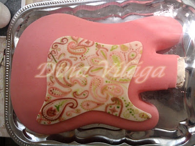 2 db 32*24-es tésztát sütöttem a testeknek. Első nagy bakim az volt, hogy bár kecsesre faragtam a gitártestet, nem számoltam a vajkrém és a szándékosan vastagabbra hagyott marcipán vastagságával, így ducibbak lettek, mint szerettem volna. A Paisley festésén sokat gondolkodtam, ott ugyanis ezüst lapon vannak nagyon apró bigyuszok, és a test is festett. Na ilyenkor sajnálom, hogy se lüszterem, se airbrushom nincs…a testfestést kihagytam, a lap kevés vizes porcukor és porfesték elegyével lett megrajzolva.