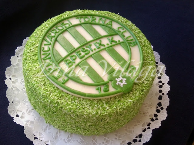 Vitéz uram elkötelezett Fradi drukker, szülinapjára a téma tehát adott volt. Már csak az volt a kérdés, hogy pálya, labda, pálya labdával, vagy címer. Az utóbbi mellett döntött barátnőm, ízben pedig a kókuszt választottuk, mert az mindenkinek favorit. Viszont nem szeretik a marcipánt, sem semmilyen bevonómasszát, így csak egy levehető körlap készült marciból. A kókusznak meg külön örültem, így lehetett füves a torta. (Nem, nem sütöttem bele semmilyen hangulatfokozó zöldfűszert, csak a kinézetére gondolok! 🙂 )