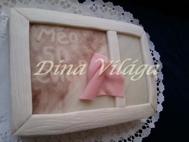 Olyan ötlete volt, hogy félig már tiszta legyen, a másik, még “koszos” üvegre meg legyen beleírva (mint koszos autóra ujjal), hogy “Még legalább 50 évig!”. Mivel nem volt túl nagy torta – 12 szeletes – nem igazán fért volna ki a legalább szó, így az kimaradt, így is sokat molyoltam azon, hogy mivel is írjak az üvegre, mivel még a kisujjam is vastagabb volt a kelleténél. Végül a fültisztító pálcika vált be, jó 10-12 darabot elhasználtam, mire sikerült kivehetővé tenni a feliratot. 🙂 Próbáltam fénycsillanást varázsolni a tiszta oldalra, nem sok sikerrel, eszembe jutott egy kis íróka is, de inkább letettem róla. Viszont így utólag azt mondom, hogy a tiszta oldalról hiányzik a látkép, azaz felül kékebb, alul zöldebb lombszerű dolgokat festenék még rá, ha lehetne, sokkal életszerűbb lenne. A keret barnán mutatna jól, de panel révén fehér lett megjelölve.