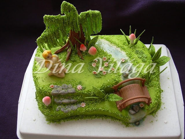 Hát akkor bemutatnám az én versenytortámat. Direkt a versenyre készült. Mivel elnéztem az időpontot (most komolyan, ez totál rám vall nem??), január végén azt hittem lecsúsztam róla, ezért mikor észrevettem, hogy február 19 a nevezési határidő, hát észvesztve kutattam A TÉMA után. Kerek alakú, meg virágos alapból kizárva, virágra van külön kategória, a virágos kerek torta meg szerintem minden, csak nem egyedi (ettől persze lehet tökéletesen kivitelezett, gyönyörű darab!!). Sűrű bocsánatkérés, ha ezzel bárkit megbántanék, szabad szám van, nem bántónak szánom, ez az én heppem. Szerettem volna valami új dologgal kirukkolni. Mivel tél révén már epekedve vártam a zöld természetet, és elég sok ilyen típusú képpel veszem magam körbe, szép lassan kialakult a terv. Lánykámnak engedve tündérke is lett rajta. :))