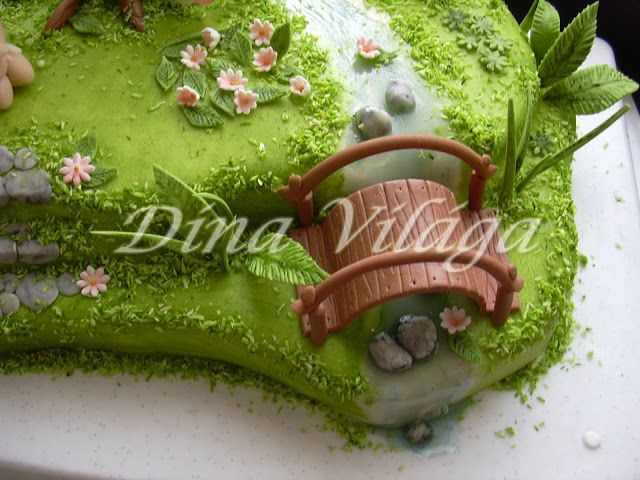 Zselatinos marcipánból készült a híd, kiskéssel lett bekarcolászva a minta, és fóliával bevont háztartási papírtörlő félbevágott gurigáján szárítottam meg, ahogyan a páfrányleveleket és fűszálakat is. Ugyanebből voltak a híd korlátai, a fa törzse és gombák is. A törzsben annyi szál virágdrót volt, ahány ág, ez stabilizálta, ugyanis alul ezek kibukkantak a gyökerek végén, így állítottam a tortába. Ja, a gombácskákban is voltak rövidke drótszárak. A fűfélékbe nem kellett, elég keményre kiszáradtak ahhoz, hogy beleszúrjam a marcipánba. A víz zselatin, a tündér marcipán, a szárnya szintén zselatinos-marci, a fa lombja és minden egyéb pedig háromszoros marcipán.