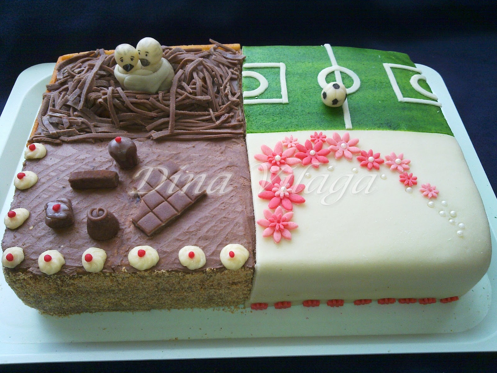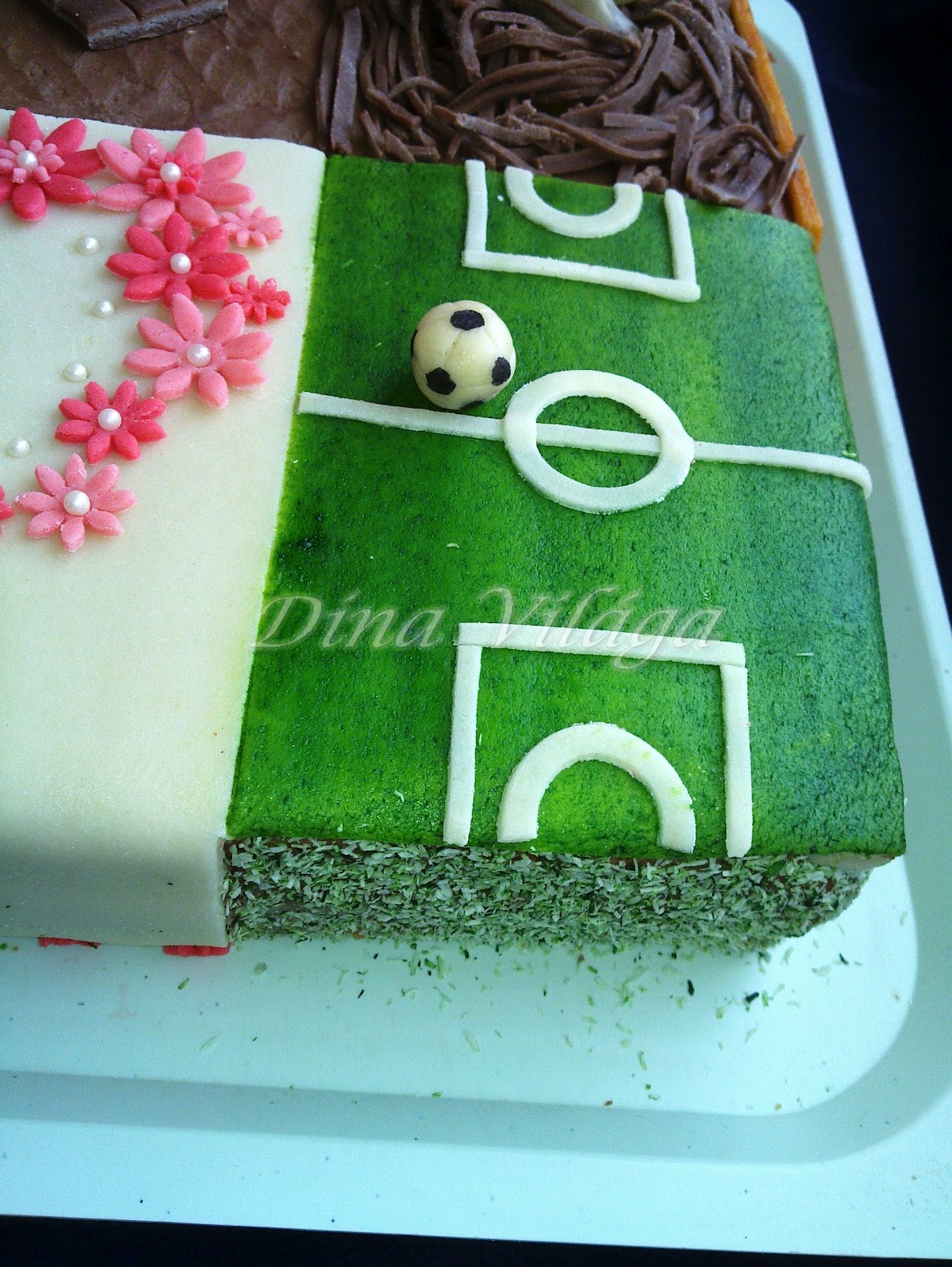 Az egész torta 20 szeletes, narancsos csokitölteléket kapott, minden egyéb marcipán rajta, illetve zöld kókusz a focipályánál, és édes morzsa a panír a csokis-csokitorta résznél. A galambos rész oldala egyébként téglamintát kapott, kéményféleséget imitálva, bár ők asszem pont nem kéményre építkeznek, de akkor mondjuk házfal teteje? 😉 Imádtam a fészket kialakítani, jó móka volt az egész.