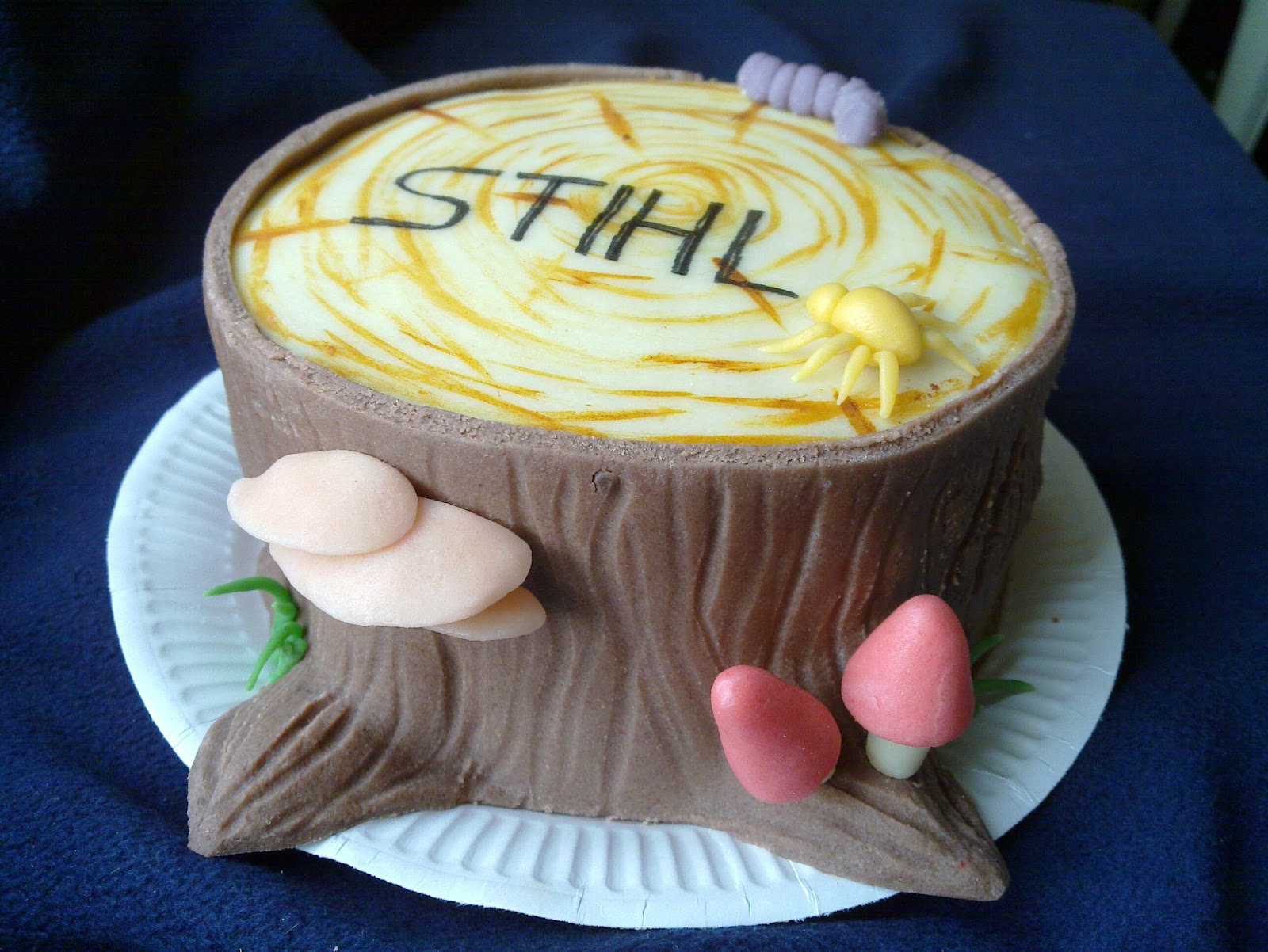 Bár a marcipán, mire barnára gyúrtam, megunta a törődést, és nekiállt morzsálni, száradozni, de fakéreg lévén, most még talán nem is haragudtam annyira érte. 🙂 Gyerkőceim segítségével születtek apróságok a tortára, kis lila hernyó, pici sárga pók, pár gomba, fűszálak. Az erezetet marcipámintázóval húzkodtam a törzsbe.