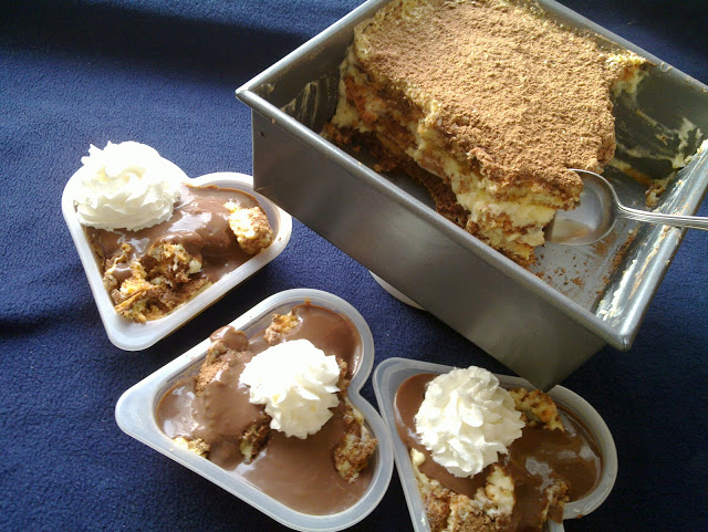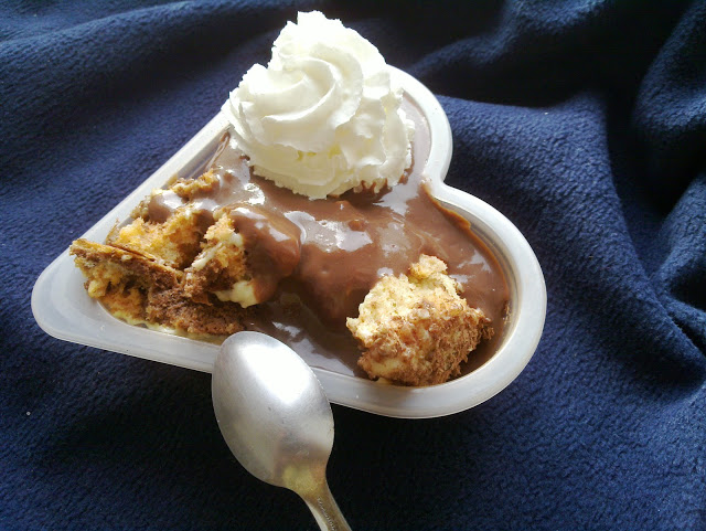 Kis tálkába evőkanállal kanyarítottam 3 galuskát, bátor voltam, mertem rá nagy merőkanállal csokiöntetet merni, majd tejszínhabstuffot biggyesztettem rá. Ebből az adagból, ha jól számolom, olyan bő 12 adag jött volna ki, ha nem lennének nagyobb tálkáink is, valamint nem kellett volna még egy adag tejszínt felverni, mert titokzatos úton-módon valahogy elfogyott magától…