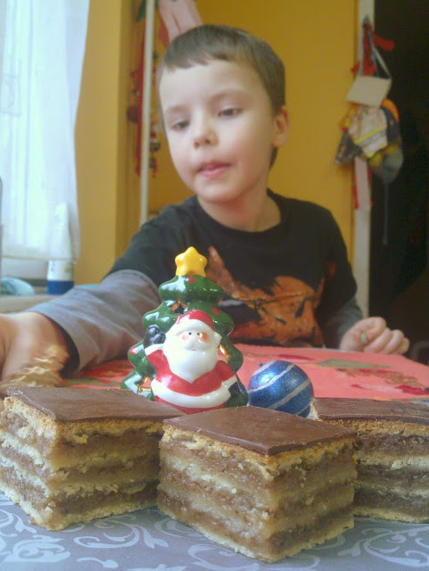 Kivéve lehűtjük, egy tábla étcsokit megolvasztva rákenünk, majd felkockázzuk. Aztán fotózás közben hagyjuk, hogy hatévesünk bohóckodjon kicsit, és türelmesen lődözünk egy sorozatot, hogy boldog lehessen. :)))