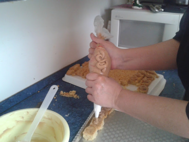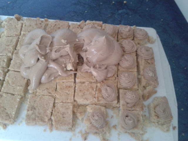 Itt már az a fázis, amikor a kihűlt, tálcára óvatosan átforgatott lapot kis kockákra próbáltam vágni. Az eredeti recept szerint ezt a lapot horizontálisan kéne kettévágni. Hát megmozdítani sem lehet, nemhogy vágni, csak az átfordításkor 4 darabra tört, a kockázáskor is repedezett össze-vissza. Gondoltam, ha tölteni nem tudom, akkor rárózsázom a krémet, így falatkák lesznek.