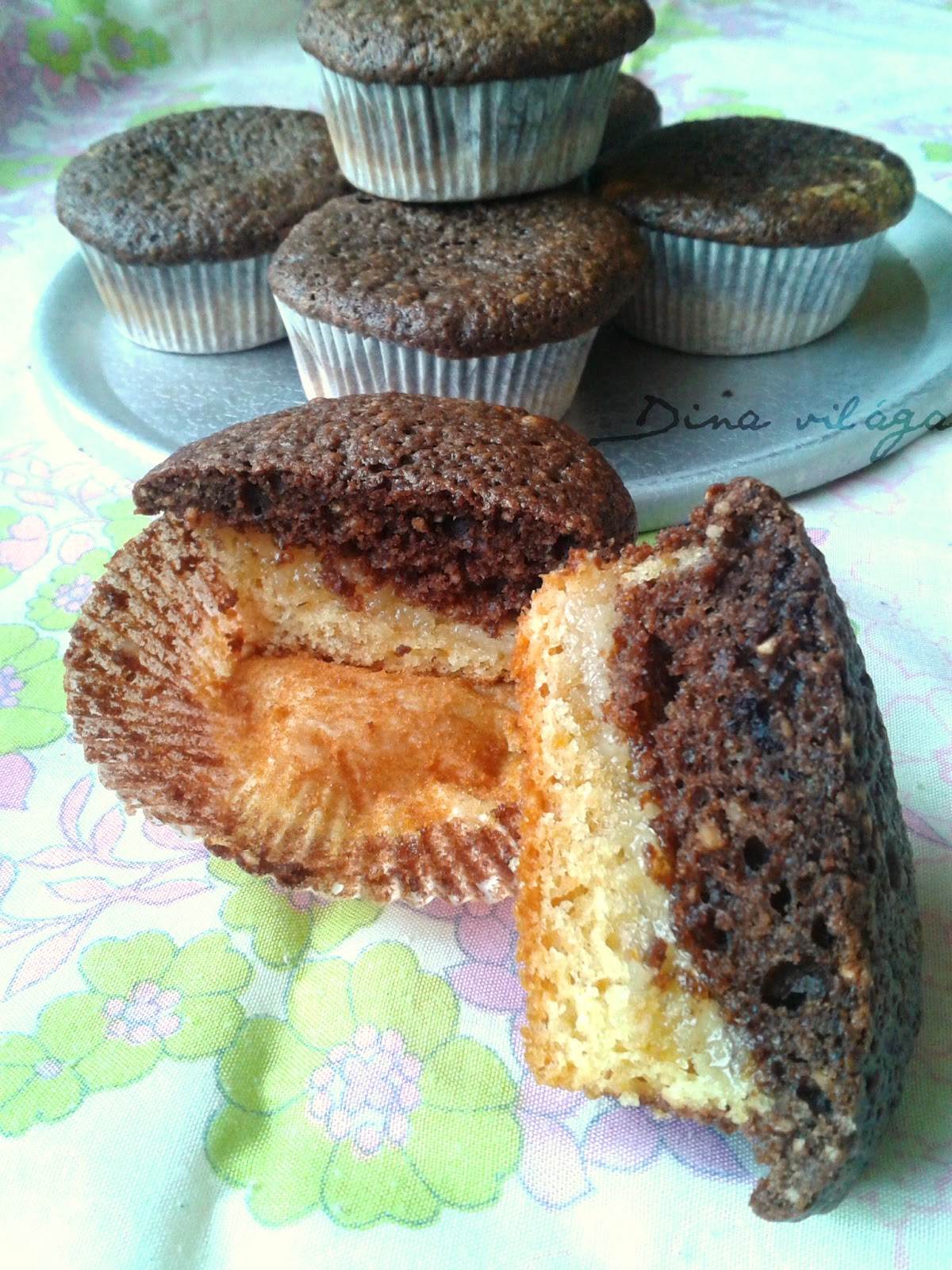 A kakaó kivételével kikevertük /a hozzávalókat sorrendben egymáshoz adva/ a tésztát. A felét muffinkapszlikba adagoltuk. Natur marcipánt kinyújtva, 12 darab kb. 5 cm átmérőjű kört szaggattunk, ezt rárakosgattuk a tésztára. A maradék masszát kakaóporral kezeltük, és elosztottuk a marcipánok tetején. Maradt egy kevés, azt külön kisütöttük, sima mogyis muffinnak. 170°C-on kb. 20 perc. Még puhának, szörcsögősnek kell lennie, de már érezni lakásszerte az illatot. 🙂