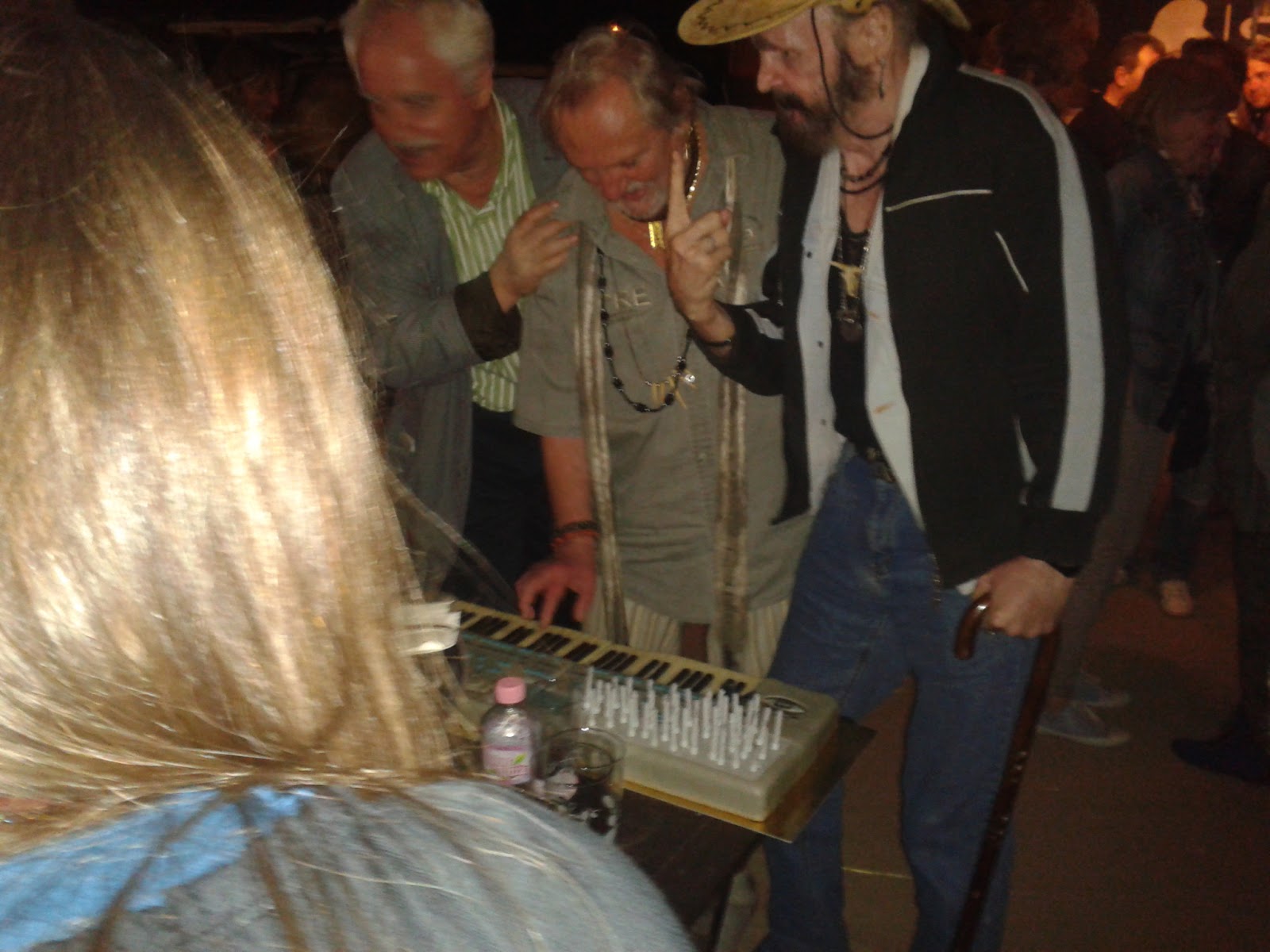Zárt körű, viszonylag kis létszámú buli volt, az ünnepelt nem is sejtett semmit. Mikor befutott, kezdett gyanús lenni neki a sok ember, aztán teljesen elérzékenyült, mikor mindannyian felálltunk tapsoltunk, és teli torokból elénekeltük neki a Happy birthday-t, persze a magyar verziót. Könnybe lábadt a szeme, és döbbenten, de mosolyogva borult a családtagok karjaiba, rögtön mindenki körbepuszilta, elhalmozta, de gyorsan középre is ültették, mert Szabó Leslie már állt is a színpadra, és eldalolta az első, bemelegítő köszöntő dalt. Onnantól már nem volt megállás, egymást váltották a zenészek, Roy és Ádám Trió, 100 Folk Celsius, sorolhatnám, aztán közösen, vegyesen, később Laci bá is felpattant a szintik mögé, és fergeteges rögtönzött Omega buli kerekedett. Nem hiányozhatott persze a Fekete pillangó sem, sőt, még tűzijáték is dörrent.