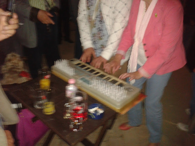 Aztán eljött az a pillanat, amitől még mindig paráztam, behozták a tortát. Dina körmöt rágva féloldalról csendben figyel. Torta a szállítás során több helyütt megrepedt, orbitális hiba. Szalag középről lemaradt, illesztés kiabálva tárulkozik, Dina ájulással küzd. Benkő arca felragyog, hatalmasat nevet, csillog a szeme, nagy baj már nem lehet. 70 darab égő gyertyát aztán egyetlen hatalmas lendülettel elfúj, ováció, aztán elhangzik, hogy ezt ki? Ezt hogy? Mire odatuszkolnak elé. Ezt te? Igen én, Boldog Szülinapot! Nem szól, átölel, két csattanós puszi, hálás mosoly. Dina elalél. Szigorúan csak lélekben, hülyén nézne ki egy porban fetrengő víziló. Onnantól csak csendesen mosolyog, és boldog, boldog, boldog, mikor azt látja, hogy eljátsszák többen is, mintha játszanának rajta. Új játékot kapott a közönség. :)))