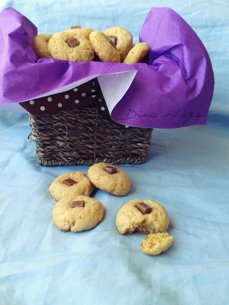 A csokin kívül mindent összegyúrunk, majd folpackba csomagolva pár órára hűtőbe tesszük. Előző nap érdemes kikeverni, sokat javít az állagán, ha alaposan tud pihenni. Másnap sütőpapíros lemezre apró, 2-3 centiméteres golyókat formázunk egymástól kissé távolabb (meg lehet hempergetni nádcukorban, mutatósabb, de ropogósabb is, ezt most elhagytam), mindegyik közepébe egy csokikockát nyomunk, és 200°C-os sütőben 4-5 perc alatt készre sütjük.
