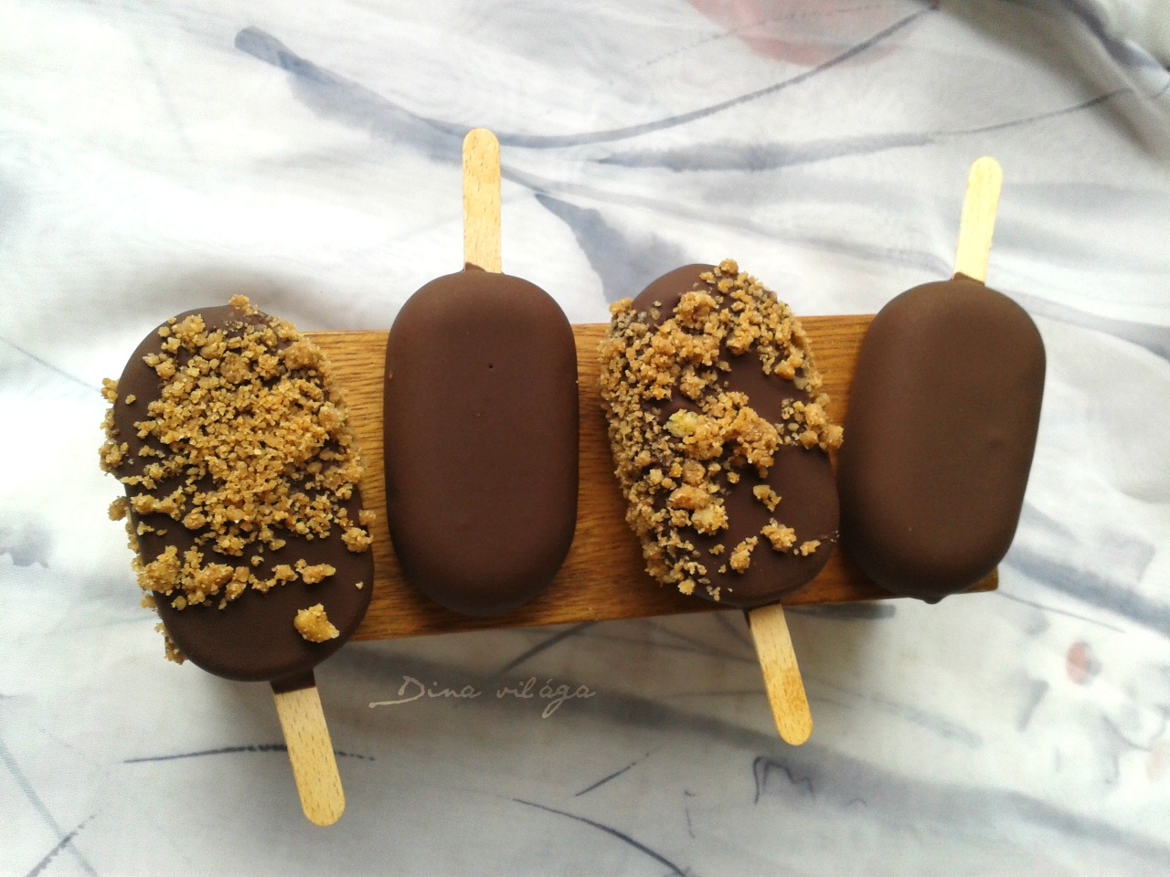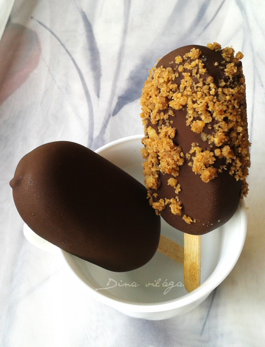 Kiemeltem a fagyikat a formából, belemártottam a csokiba, és enyhén rázó mozdulatokkal igyekeztem vékonyítani rajta. Roppant gyorsan ráfagy, csak pár másodpercig kell kézben tartani, vagy ezen idő alatt magtöretbe (mogyoró, mandula, stb.) forgatni. Nálam ez most diómorzsa volt, ami darált dió, darált keksz, rum, pici olvasztott vaj morzsásra gyúrva, kis időre tálcára kiterítve szikkadni, hogy ropogós legyen. Jól passzolt hozzá! 🙂