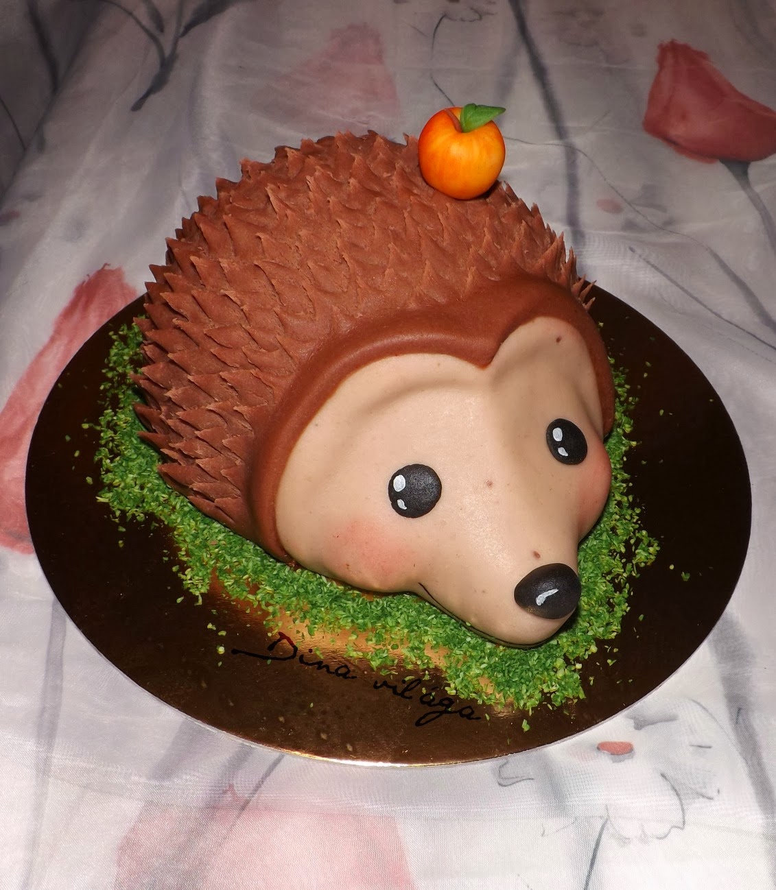 A hátára egyenként kidolgozott tüskéket terveztem volna, ám napokba telt volna egyesével fogpiszkálóra vagy virágdrótra tűzdelni, festegetni, és úgy a tortába szúrni a tüskéket, mellesleg sokat kellett volna vacakolni vele, hogy az ehető részekhez férjünk. Bár egyszer tuti megcsinálom úgy is, mert már befészkelte magát a buksimba a technika.