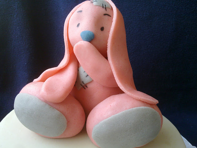 Rózsaszín puncstorta az alap, a nyuszi pedig kakaós puncsmassza, marcipánnal bevonva. Mit mondjak, nem volt egyszerű.