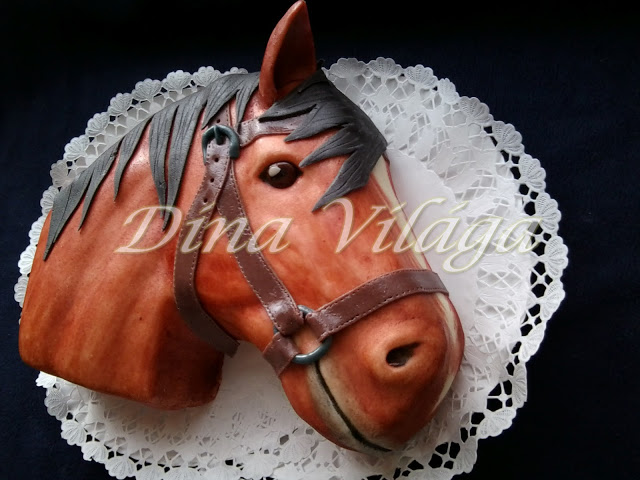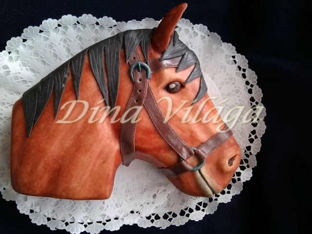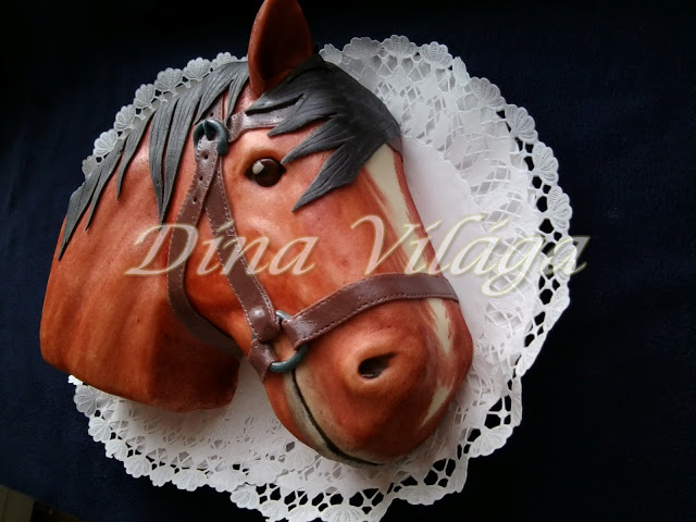 Először szivacslabdával, aztán mivel nagyon vékony réteget vitt fel, hát ecsettel, de az meg túl csíkos volt (a festék ugye híg), hát rámentem kézzel, ujjal, tenyérrel, ahol kellett. Végül csak kialakult többé-kevésbé az, ami már tetszett. Próbáltam a szemét a lehető legélethűbbre kialakítani, a szemöldökcsont is nagyot dobott rajta. Az orra, szája már magától, a füle most különálló marcipánból, így sokkal szebb. Bőrszalagok, csat, és a sörény, jobb híján lapos, karcolt marcipánnal. A lényeg, hogy Kriszta csak csatig engedte felvágni a nyaka felől, és jót kuncogtam, ahogy párja győzködte, hogy márpedig muszáj, mert a mamiék még nem is ettek belőle, ő meg kislányos daccal durcázott. 😀 Persze csak brahiból, hisz komoly felnőtt nő, de néha olyan jó kislánynak lenni nem? :))